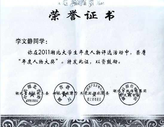 "2011 年湖北大学生年度人物"颁奖典礼于4月26日在湖北省楚天传媒大厦举行,备受关注的荆州"信义女孩"李文静榜上有名,学校领导、系部领导以及肖虹辅导员一起陪同李文静去颁奖,省政府资政段轮一为其颁奖。在回学校的路上,李文静说"今天获奖很激动,同时我感到很温暖,我的成长离不开大家的支持,虽然不幸,但一直在爱的呵护下长大,我愿意一直阳光下去,用我的微薄力量去将爱心传递。"