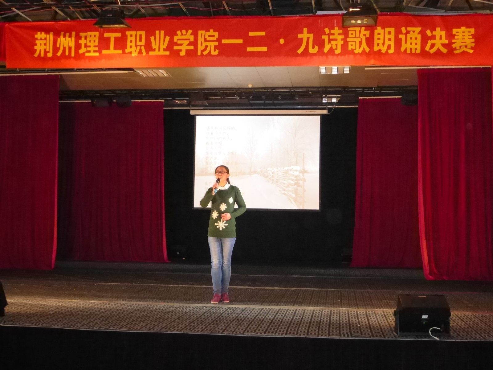 (本报记者吴佳秋、周青云联合报道)为了弘扬爱国主义、集体主义的光荣传统。用优秀的名族精神熏陶学生、引导学生。于12月9日晚7点,由院团委主办,演讲与口才协会承办,广播台协办的"荆州理工职业学院一二·九诗歌朗诵比赛"在我院活动中心举行。到场的评委及嘉宾有学生工作处王处长、学生工作处潘老师、经济管理系詹书记、照明与电气工程系张老师、机械工程系孟老师、化学与建筑工程系吴老师、人文与社会科学系李老师、信息与智能工程系陈老师。