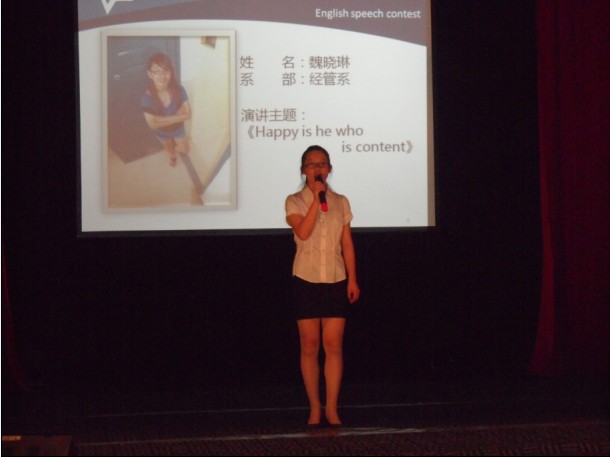 此次演讲比赛从初赛到此刻决赛的层层选拔,最终有十名选手晋级决赛,站在此刻灯光闪烁的舞台上。选手们一一的在舞台上展示自己最优秀的一面给在场的每一位观众与评委老师。首先出场的来自经济管理系2012级会计班的魏晓琳,她为大家带来的演讲题目是《Hahhy is he who is content》,她用流畅的语调为大家真情的演讲完,用英语来阐述自己心中的快乐,什么是知足常乐,也赢得了在场观众的一阵阵掌声。不知是她,我们经济管理系踊跃出了众多的热爱英语的同学。同样来自12会计班的高珊、韩娇娇的倾情演讲,在韩娇娇注入自己深情激昂的演讲后,更是让现场响起了雷鸣般的掌声。还有12工商管理班付征,也是十分的优秀,一口流利的英语脱口而出,让人不得不在不绝口。不仅我们系存在优秀的英语爱好者,其他系的选手也是十分的优秀,可以看得出来她们的英语基础十分的优秀和在场下的练习,所以才有今天精彩的一幕幕。
