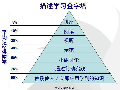 2013年8月我系9名专业教师受荆州市人社局创业中心邀请,赴天津创业指导服务中心进行了为期十天的SYB创业师资培训,期间印象最深刻的就是《参与式教学方法》、《成人学习原理》,它提出使用头脑风暴法、角色扮演法、游戏法、案例法、练习法、讨论法、讲授法等参与性培训方法,让学员通过主动介入教学活动的方式更加专心致志地学习,学会应用新技能,并详细描述了承认学习金字塔。