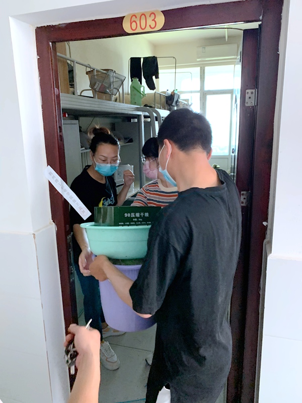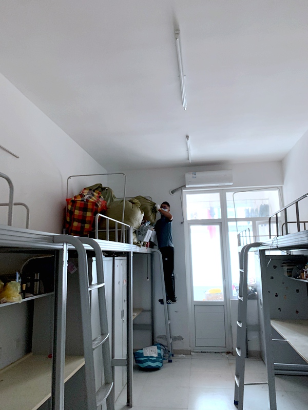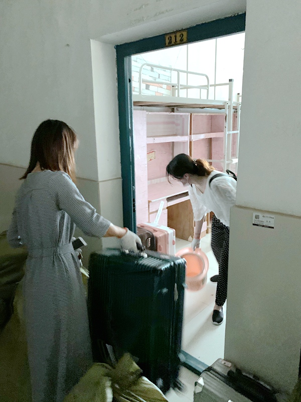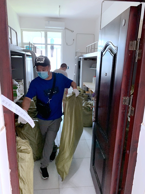 工作中,负责教职工们按照包裹上的寝室号及床位编码,将之前打包好的物品一包包搬回宿舍,并再次对宿舍进行清洁,保证每个房间干净、整洁。