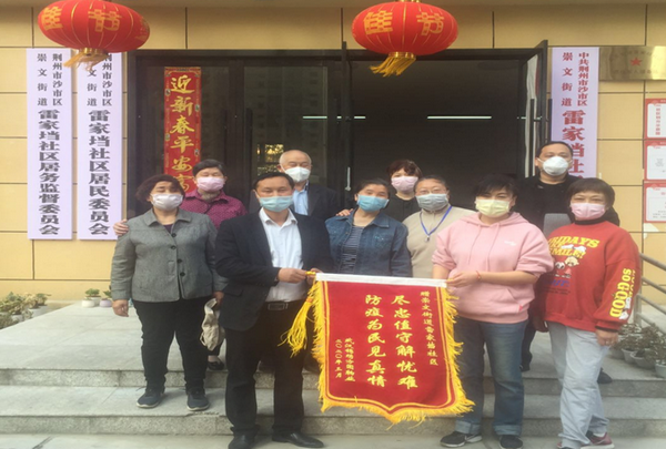3月20日下午,雷家垱社区大厅门口里,温情涌动。雷家垱社区绿地小区居民和物业朱经理手捧锦旗,送交到社区书记王敏莉的手中,并感谢一直奋战在抗击疫情防控一线的社区工作人员,帮助小区居民平安顺利地度过防疫期。"尽忠职守解忧难,防疫为民见真情",锦旗上的16个金色大字醒目而富含蕴意。