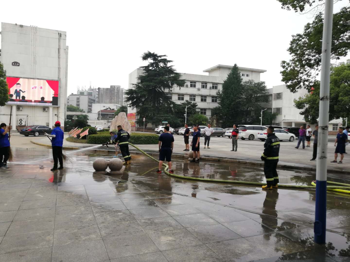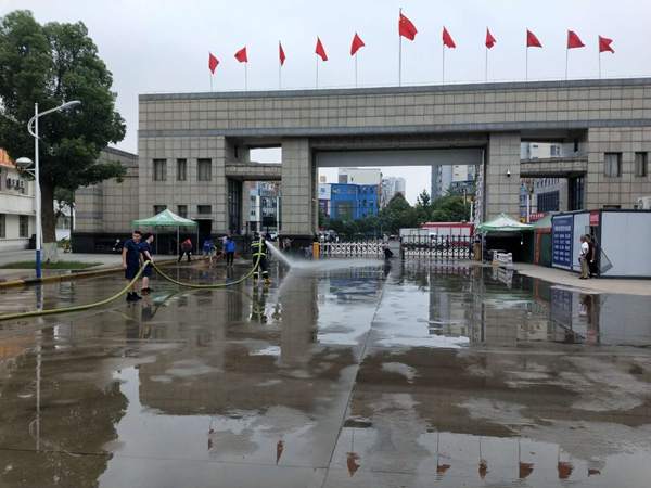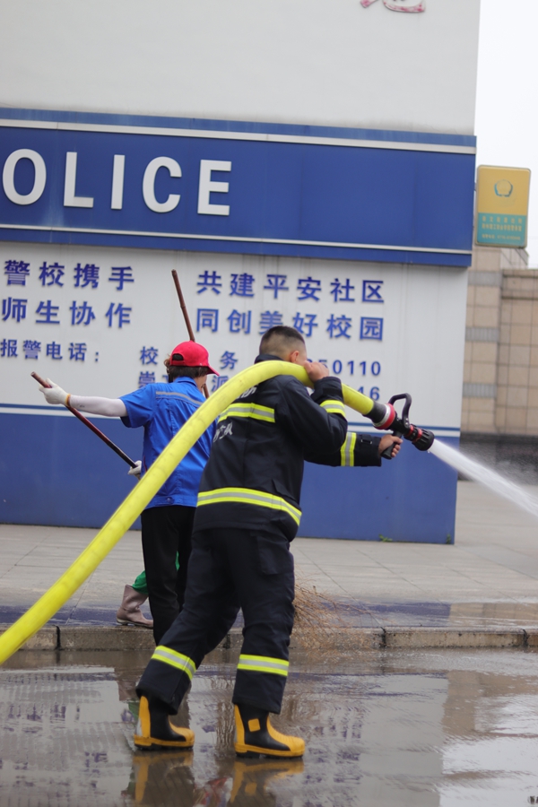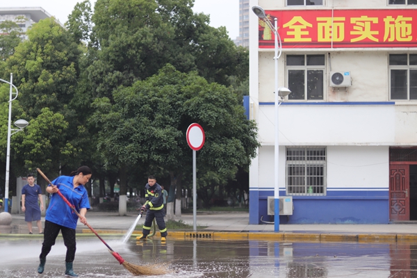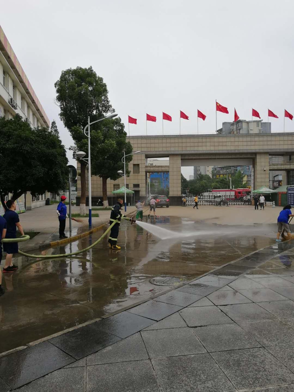 为响应我市打好创文攻坚战的号召,保障师生的出行安全和身体健康,7月14日下午,荆州市公安消防支队中山中队组织官兵义务冲洗校内道路。消防官兵到达学校后,利用消防车对路面的淤泥、污渍进行了冲洗。经过近一个小时的奋战,校园内主要道路被洗刷一新,恢复原貌。
