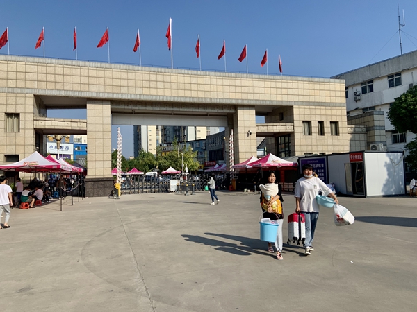 报到现场,返校学生佩戴口罩、保持安全间隔距离,有序排队进入校园。出示"健康码"、登记签到、测量体温、行李消杀等环节有条不紊地进行。虽然返校学生较多,但校园入口始终保持畅通,没有形成拥堵。各二级学院积极响应学校号召,安排专人专班在校门口值守,全天候接待报到学生。学校还设置了咨询接待处、绿色通道、宿舍安排、治安服务等服务点,实用的遮阴帐篷、贴心的饮用水和风扇、简明的报到指南、细致的解答指引给学生最温馨的服务。