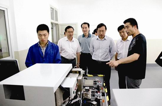 ,市委书记李新华一行到我院就学院的办学特色及校园基本情况进行调研。李书记专程参观了我院中央财政资金支持的国家级示范性电光源技术实训室,走进固晶站和焊线站详细询问了操作流程及产品用途,并观摩了我院学生的现场实训。