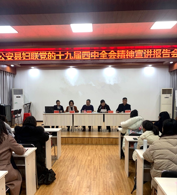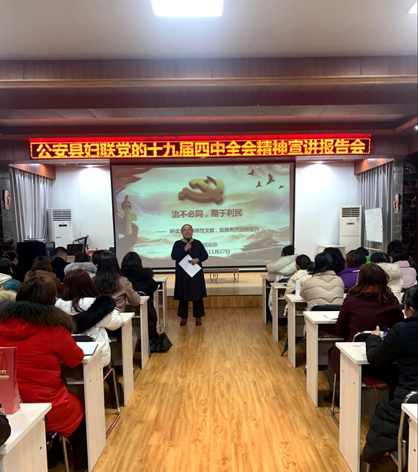 10月27日上午,公安县妇联开展党的十九届四中全会精神学习宣讲会,特邀荆州理工职业学院党委委员、副校长,湖北省高等教育学会产学研合作教育专业委员会理事田远芬作宣讲报告。