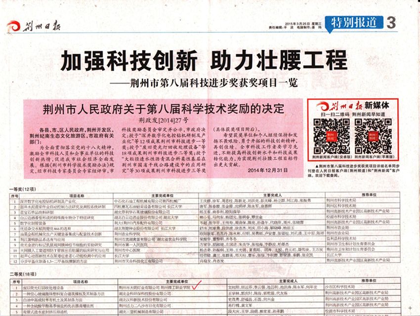 第八届科学技术进步奖评出一等奖12项,二等奖18项,三等奖30项,我院位列二等奖之首。大会动员社会各方面力量积极投身大众创业、万众创新伟大实践,为加快荆州振兴提供科技支撑。市委书记李新华就进一步加强科技创新工作提出要求,市长李建明主持会议。