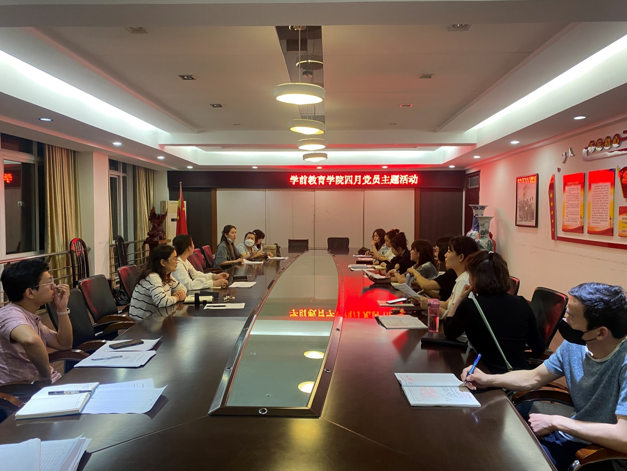 2022年4月24日晚上,学前教育学院党支部全体党员在东校区艺术楼307会议室开展"聚焦‘双优化’、冲刺三千亿"主题实践活动。