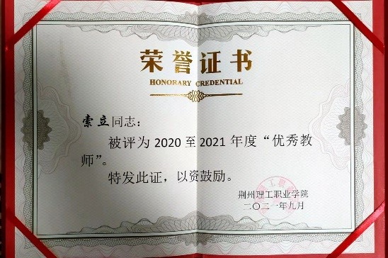 2021年9月,索立老师因善于钻研教学广受师生好评,获荆州理工职业学院2020-2021年度"优秀教师"荣誉称号。