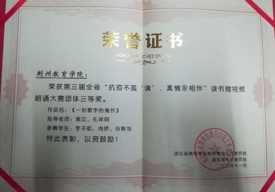 2020年11月,索立老师指导学生参加湖北省第三届"抗疫不孤‘读’,真情永相伴"读书微视频朗诵大赛,获团体三等奖。