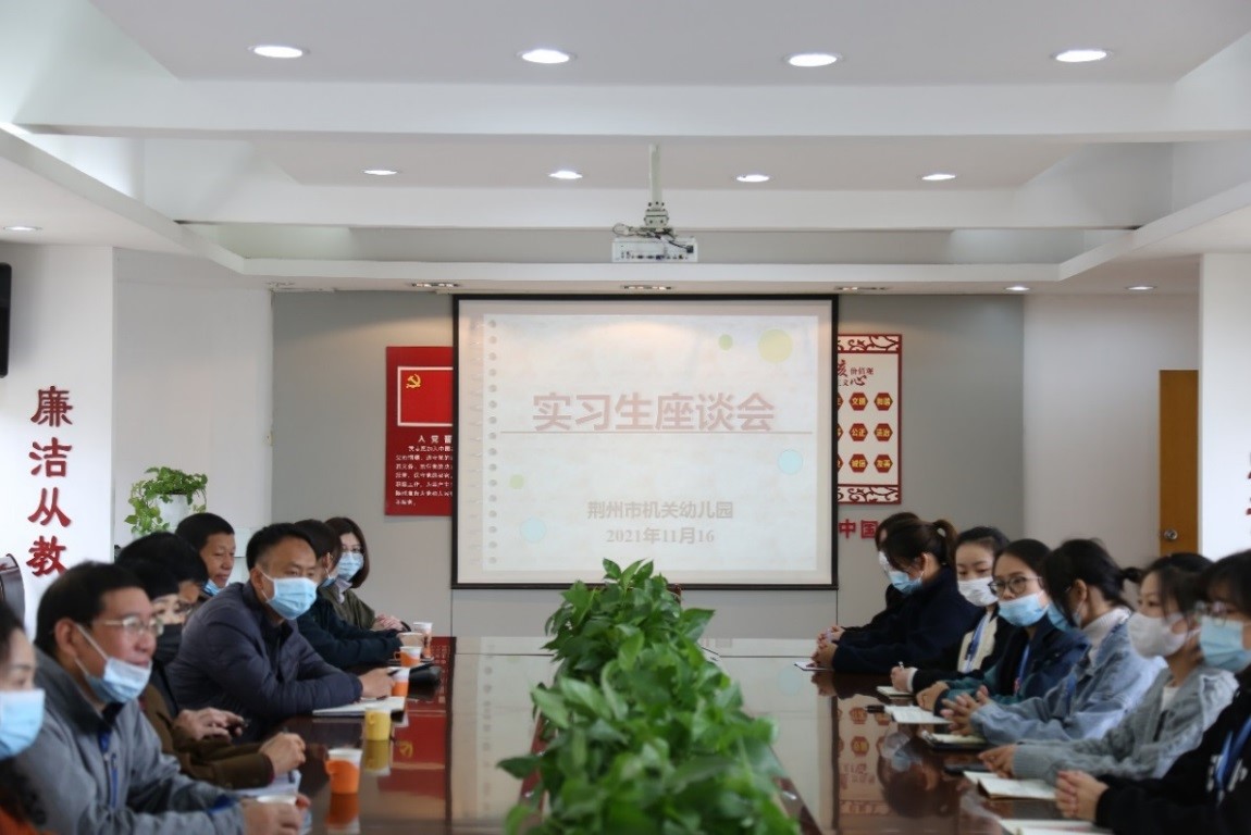 潘校长一行首先来到的是荆州市机关幼儿园,该园是荆州市政府办公室直属全日制公办幼儿园,也是湖北省首批省级示范幼儿园。在幼儿园李园长的带领下,一行人参观了幼儿园的基础设施,观摩了教学活动,同时也听取了幼儿园特色课程的介绍。在座谈会上,园长重点介绍了如何帮助见习生迅速成长,对我院勤劳积极、谦逊刻苦的见习生给予了高度的好评,并指出学生态度端正、工作踏实,并提出了在接下来的见习中,希望学生多学习,多锻炼,弥补不足。