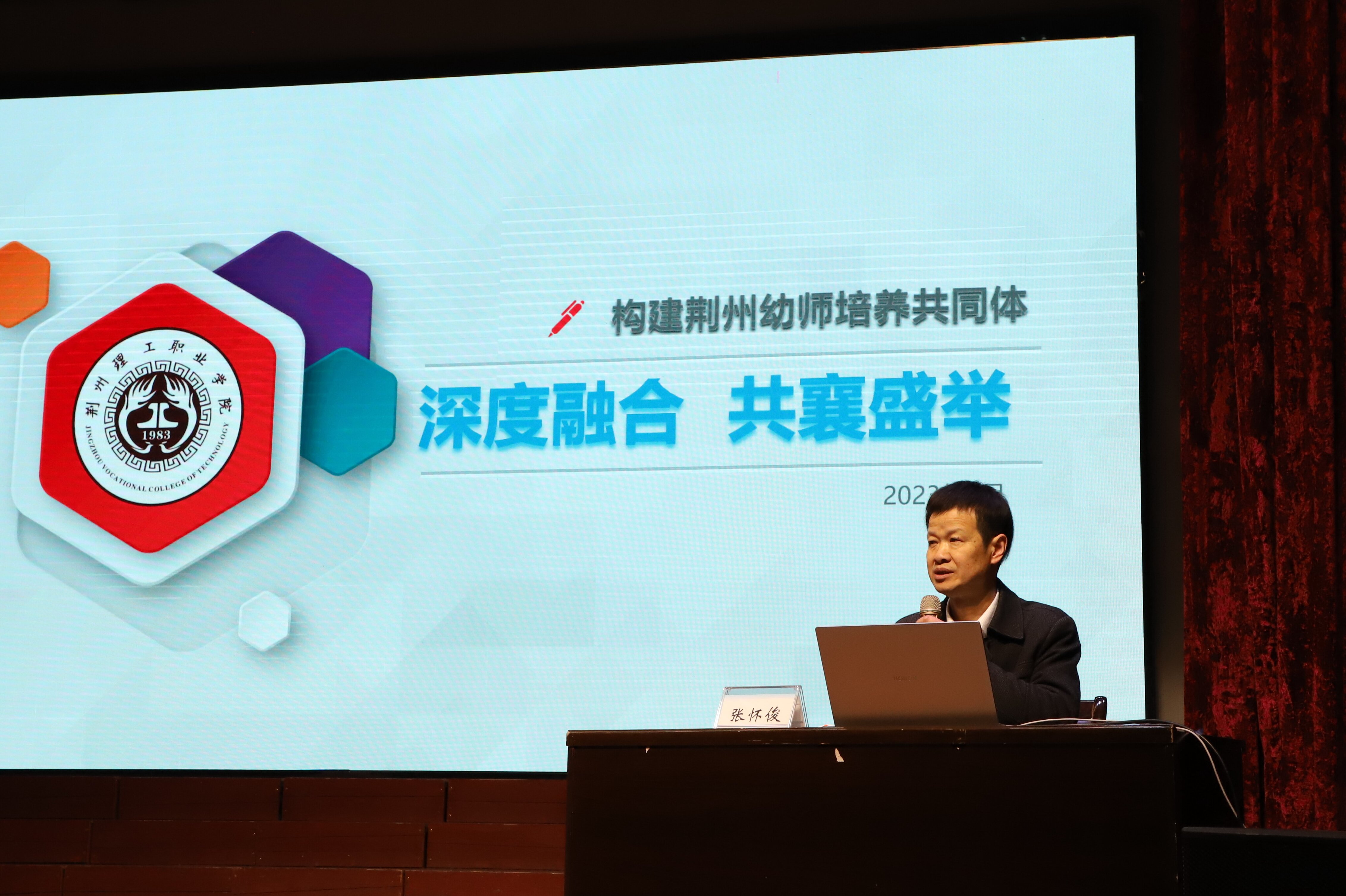 2023年3月25日9:00,荆州学前教育职业教育联盟大会在荆州理工职业学院召开。荆州市委教育工委副书记、市教育局党组成员刘立富,荆州理工职业学院党委书记潘贤君、荆州市卫生健康委员会人口家庭发展科科长陈丹、长江大学教授陈竞蓉、荆州市教育局职称科科长吕雪茹及所有联盟理事单位代表及联盟成员参会。会议由荆州理工职业学院党委副书记、校长肖云林主持。