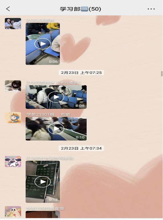 比赛时间持续整个4月,程序是院学生会学习部统一安排每天练习的内容并发至学习群,各班级利用每天早自习前十分钟进行练习,写完放在教室外面排列好,各班学习委员拍小视频发到学习委员群里,学习部留存存档。另外学习部早自习也会安排专人进行检查,对书写规范、结构合理、布局美观的小黑板拍照留存。比赛设优秀班级和优秀个人两个奖项。优秀班级从每天班级带黑板情况、内容完成情况及书写水平几方面综合评分。最终,学前19502班、学前21301班、学前21303班、学前21304班获得"优秀班集体"荣誉称号。