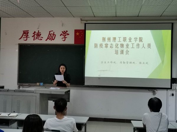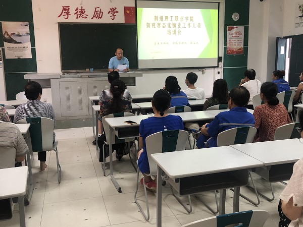 为适应开学后学生公寓疫情防控新形势,加强对开学后宿舍学生的管理,8月23日下午3点,我校在道之楼101教室举办了2020年秋季学期开学准备工作宿舍管理人员培训会。此次培训会由学工处举办,培训对象为物业全体成员、宿舍管理员和保洁员,培训主要内容为学生返校后宿舍的各项管理工作。