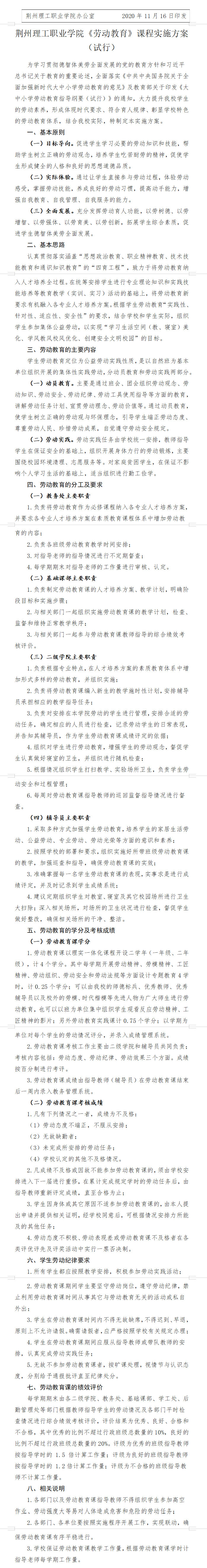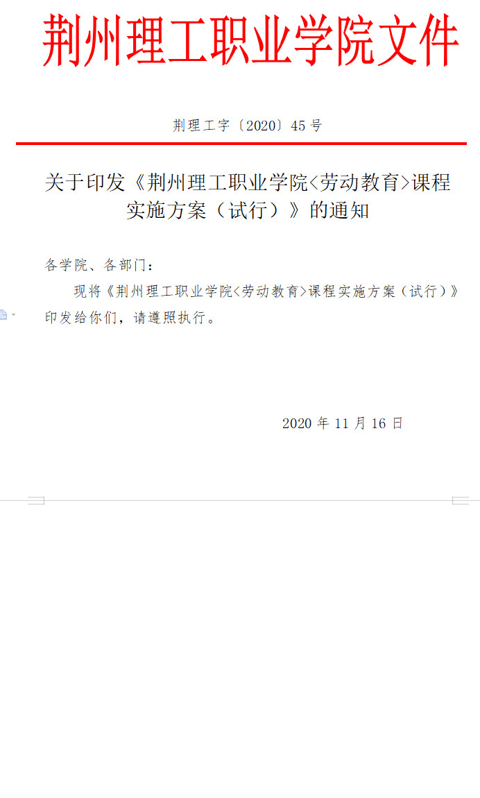 关于印发《荆州理工职业学院<劳动教育>课程实施方案(试行)》的通知