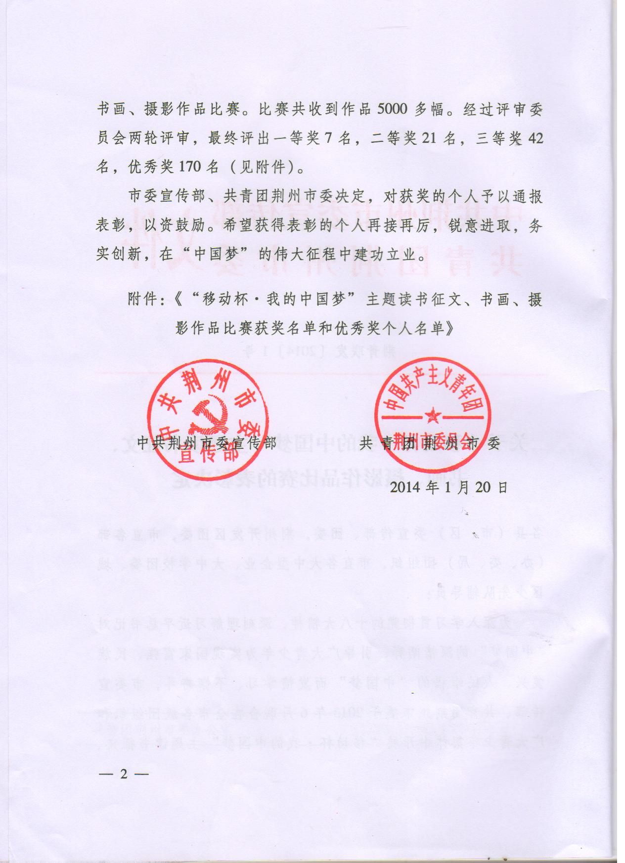 为深入学习贯彻党的十八大精神,深刻理解习近平总书记对"中国梦"的深情阐释,引导广大青少年为实现国家富强、民族复兴、人民幸福的"中国梦"而发愤学习、不懈奋斗,市委宣传部、共青团荆州市委于2013年6月在全市各级团组织和广大青少年中开展"移动杯·我的中国梦"主题读书征文、书画、摄影作品比赛,经由我院团委推荐的梅雄同学荣获书画作品三等奖。