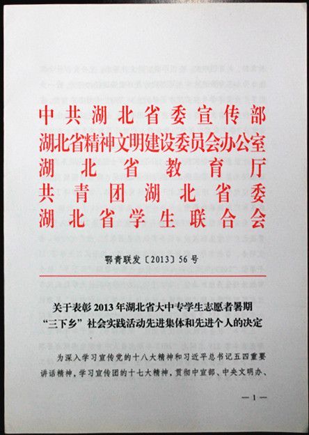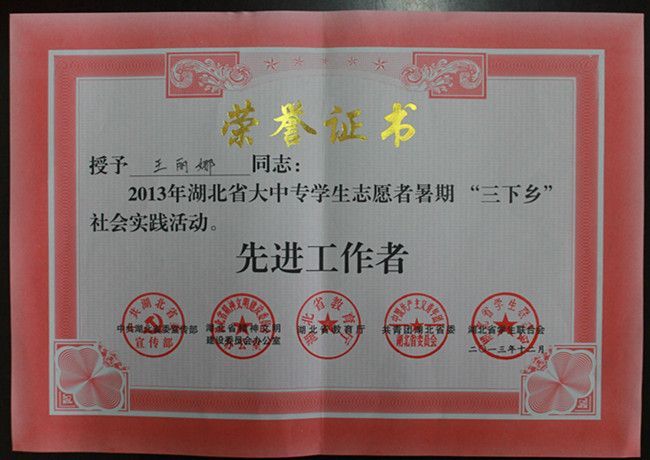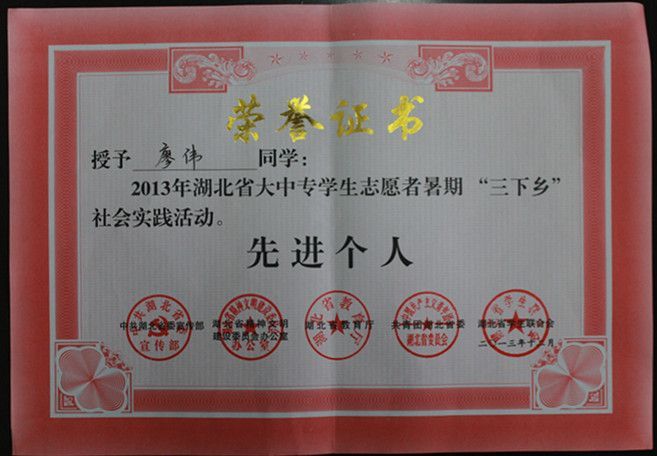廖伟同学"2013年湖北省大中专学生志愿者暑期‘三下乡’社会实践活动先进个人"荣誉称号