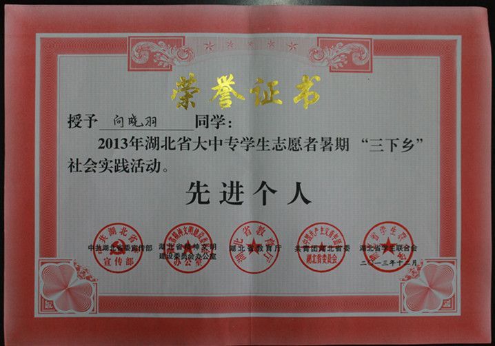 向晓雨同学"2013年湖北省大中专学生志愿者暑期‘三下乡’社会实践活动先进个人"荣誉称号