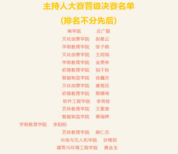 经过激烈的角逐,选手们凭借丰富的主持经验和稳定的发挥,最终有16名选手成功晋级决赛。希望有更多热爱主持的同学们能聚集在这个光辉的舞台,用话筒点亮人生梦想。也让我们一起期待晋级选手在决赛中的精彩表现吧!