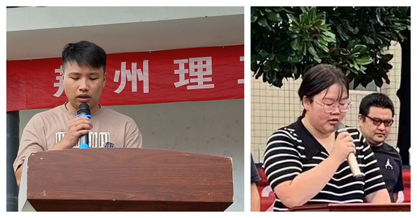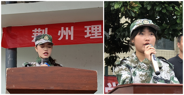 东校区学前教育学院2023级学前教育10班泉明卓同学、中校区建筑与环境工程学院水净化与安全技术专业1班周诗琪同学,分别代表2023级新生作军训表态,表示将服从命令、听从指挥、严守纪律,培养坚定顽强的意志和吃苦耐劳的精神,圆满完成本次军训任务。