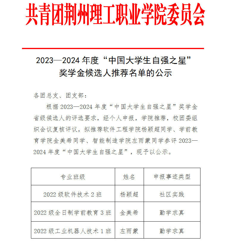 2023—2024年度“中国大学生自强之星”奖学金候选人推荐名单的公示