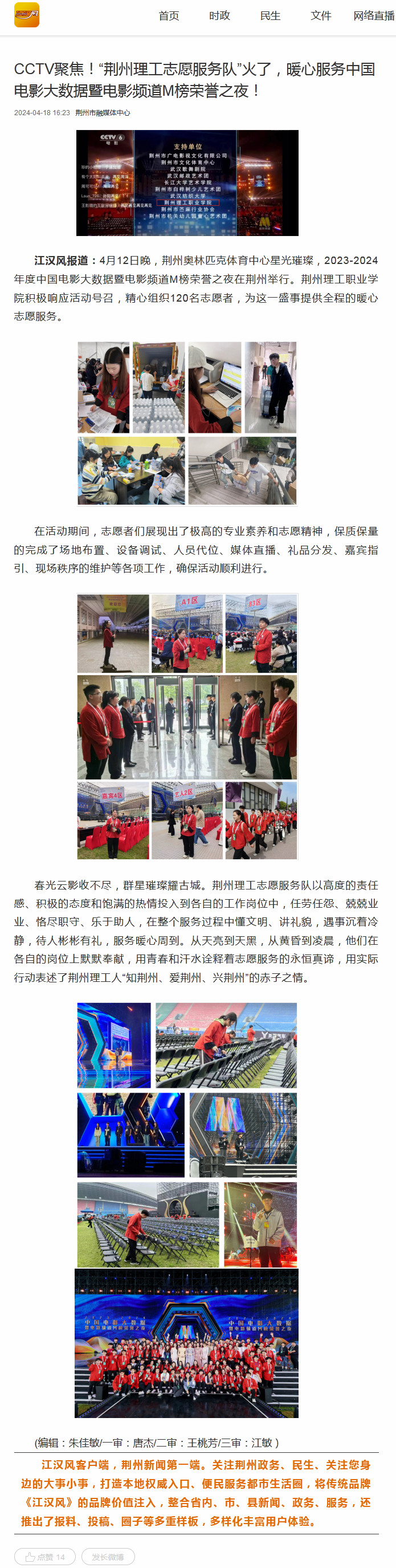 CCTV聚焦!“荆州理工志愿服务队”火了,暖心服务中国电影大数据暨电影频道M榜荣誉之夜!