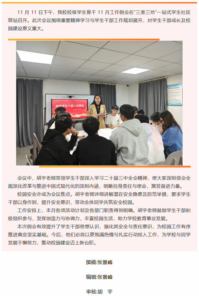 “三室三坊”一站式动态|我校召开11月校级学生骨干工作例会