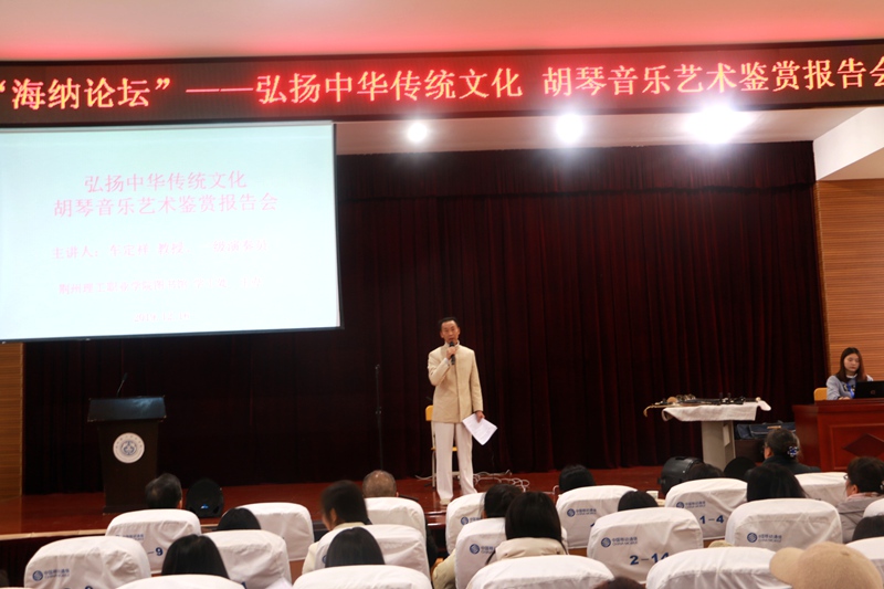 本次《海纳论坛》我们荣幸地邀请到了原荆楚理工副校长、一级演奏员车定祥教授作为主讲嘉宾。车教授在胡琴音乐艺术方面造诣颇深,他为师生们介绍了二胡、低音胡、高胡、京胡、板胡、中胡等不同风格的乐器。带我们领略了胡琴的音色及演奏特色,以精湛的演奏技艺为大家演绎了《山丹丹开花红艳艳》等多首红色经典曲目以及《二泉映月》等名曲。为大家带来了一场极具感染力的音乐视听盛宴。台上台下相互辉映,爱国之心在每个人心中涌动,一场惊艳、完美、无与伦比的演奏会在师生经久不息的掌声中落下帷幕,观众意犹未尽。音乐与灵魂在这里交融,古典与时尚在这里融合。精彩的胡琴演奏让师生们深深地感受到了民族音乐的魅力,正所谓"只有民族的,才是世界的。"