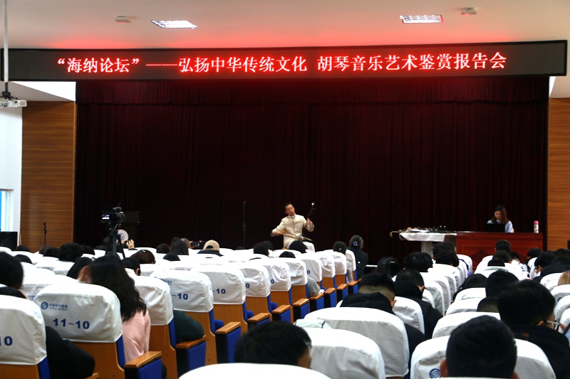 12月16日下午3:00,由图书馆、学工处主办的《海纳讲坛》——弘扬中华传统文化 胡琴音乐艺术鉴赏报告会,在学术报告厅举行。副校长田远芬、工会主席秦燕铭以及来自各学院部分师生参加报告会,纪委书记黄勇主持会议并致辞。