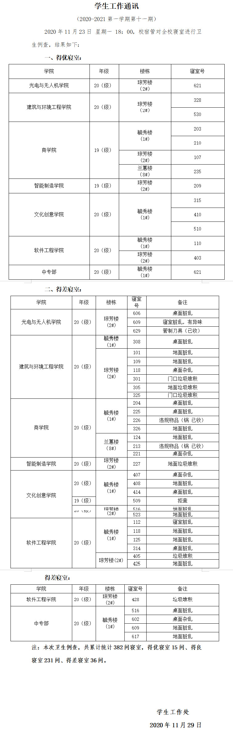 关于十一月份辅导员住寝情况的通报