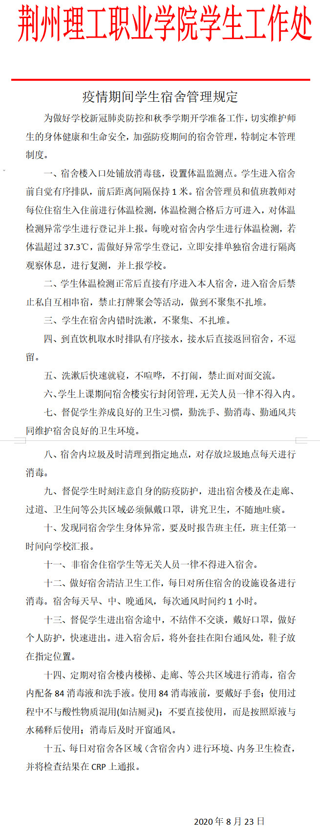 荆州理工职业学院疫情期间辅导员驻寝值班制度