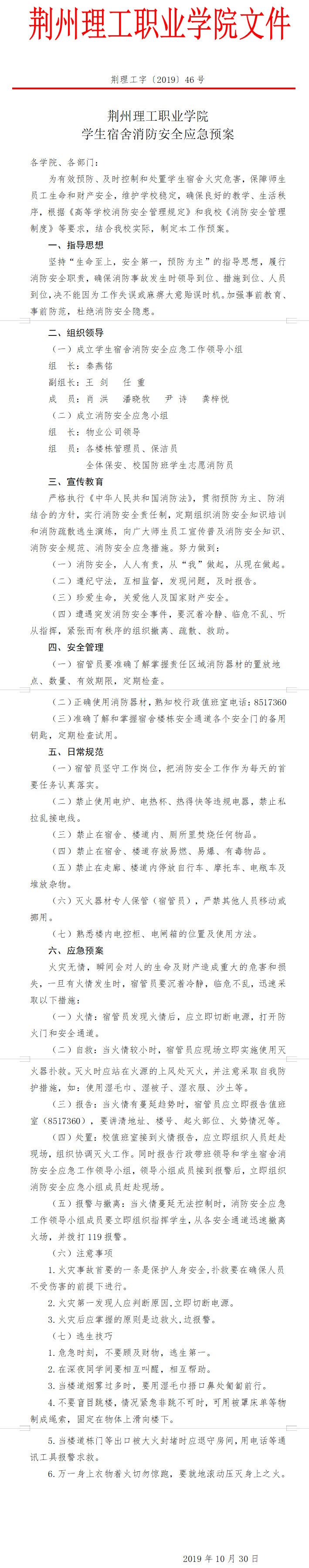 荆理工字〔2019〕46号学生宿舍消防安全应急预案