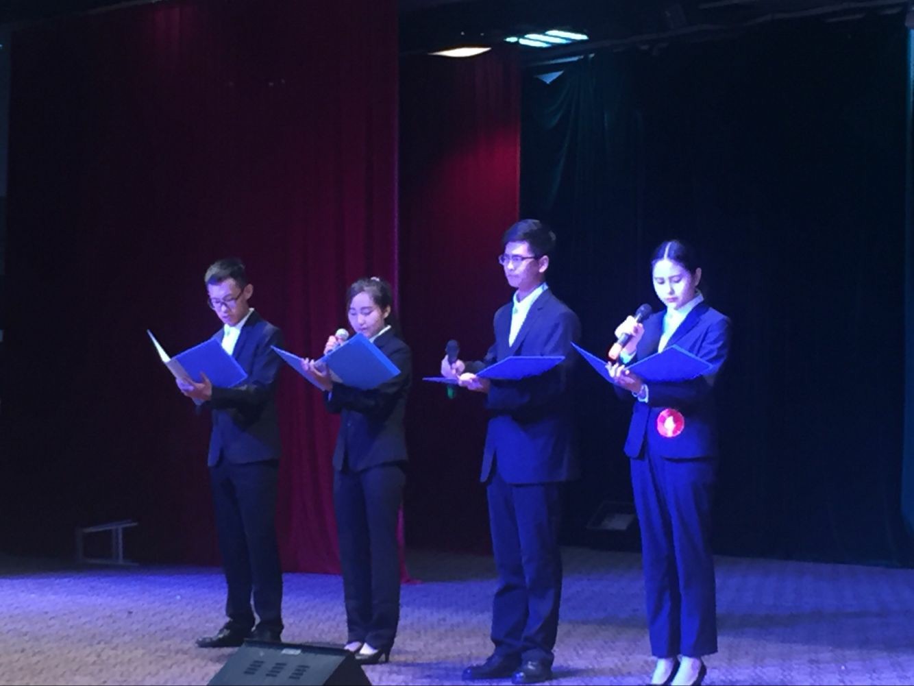 本次活动在主持人热血轩昂的开场白中拉开了序幕。同学们群情沸腾,选手们精神抖擞,朗诵的文章使人内心无法平静。有的赞美祖国,也有的批判内战。最后在观众们对一二·九朗诵比赛决赛的期待中拉下了帷幕。