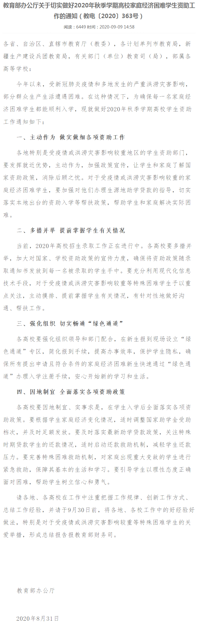 教育部办公厅关于切实做好2020年秋季学期高校家庭经济困难学生资助工作的通知(教电〔2020〕363号)