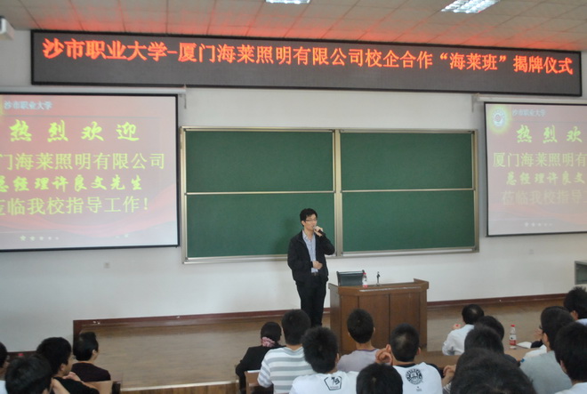 我院与厦门海莱照明科技有限公司建立了长期的合作关系,该公司是我院电光源技术专业的校外实训基地,并成立了电光源技术专业特色班:"海莱班"该公司每年向特色班的学生提供助学金与专业建设基金五万元