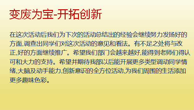 如果要我用四个字总结我部这学期的工作,那就是有得有失。成功的经验我们需要借鉴。例如从我部主办活动以及各次协助其它部承办的的活动中,我们学会了如何在活动前认真细致的做好工作的安排和人员的调动,冷静处理在活动中遇到的一些突发问题,有条不紊的做好活动后的总结与反思。同时,失败的经验教训我们更需要汲取,有时候失败才是我们真正的老师。我们明白,失败总是难免的,学生会的工作也不例外,只有从一次次的失败中我院的学生会才能不断的成熟壮大起来。具体而言,就我部来说,学院活动举办的晚会成功与否关系到我院每次活动的形象。就像一首歌曲一样,它是整首歌曲的前奏,只有拥有优美的前奏才能带动整首歌的气氛。对于成功,那只能代表过去,我部前进的步伐从来不曾停止,加强自身的建设工作迫在眉睫。在今后文艺部的工作中,我们会本着戒骄戒躁的工作态度,不断改善工作中的不足之处,明确文艺部的定位,举办有特色的活动,做好本份工作,加强我部与其它各部的交流与合作,以一名学生干部的标准更加严格的要求自我,追求更高的工作效率,坚持全心全意为同学们服务的原则,做好本部门工作,树立良好的人文学院学生会形象。