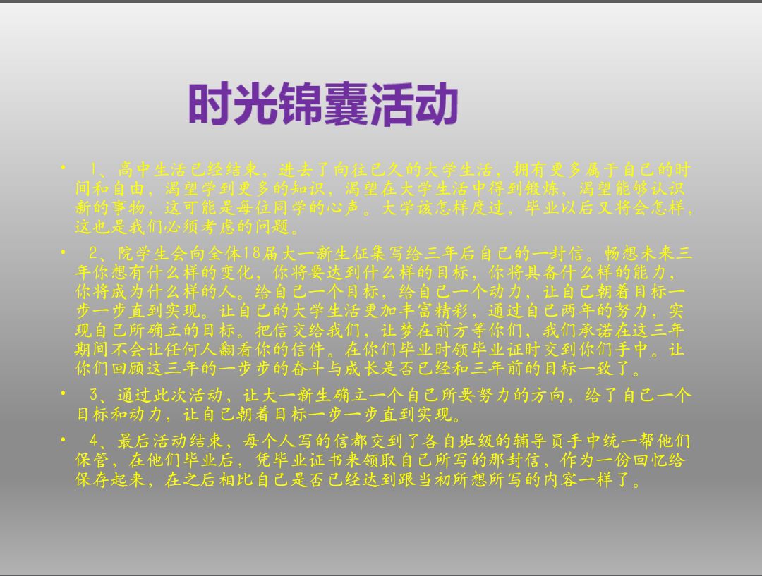 2、在学生会在举行活动时要细心细致的做好宣传以及配合其他部门的工作,以保障活动的顺利进行。其中的具体工作包括:宣传海报的设计,以及拍照收集活动中精彩的画面;3、要加强与其他部门的联系和交流,从而在工作上更好的相互配合,共同为学生会,为其尽出自己的一份力。