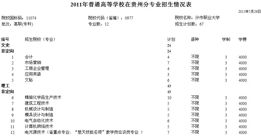 贵州省2011年招生计划--高职(专科)(贵州省招生考试中心)
