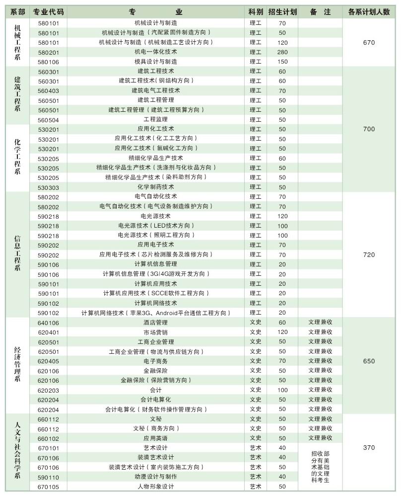 荆州理工职业学院(原沙市职业大学)2011年各专业招生计划
