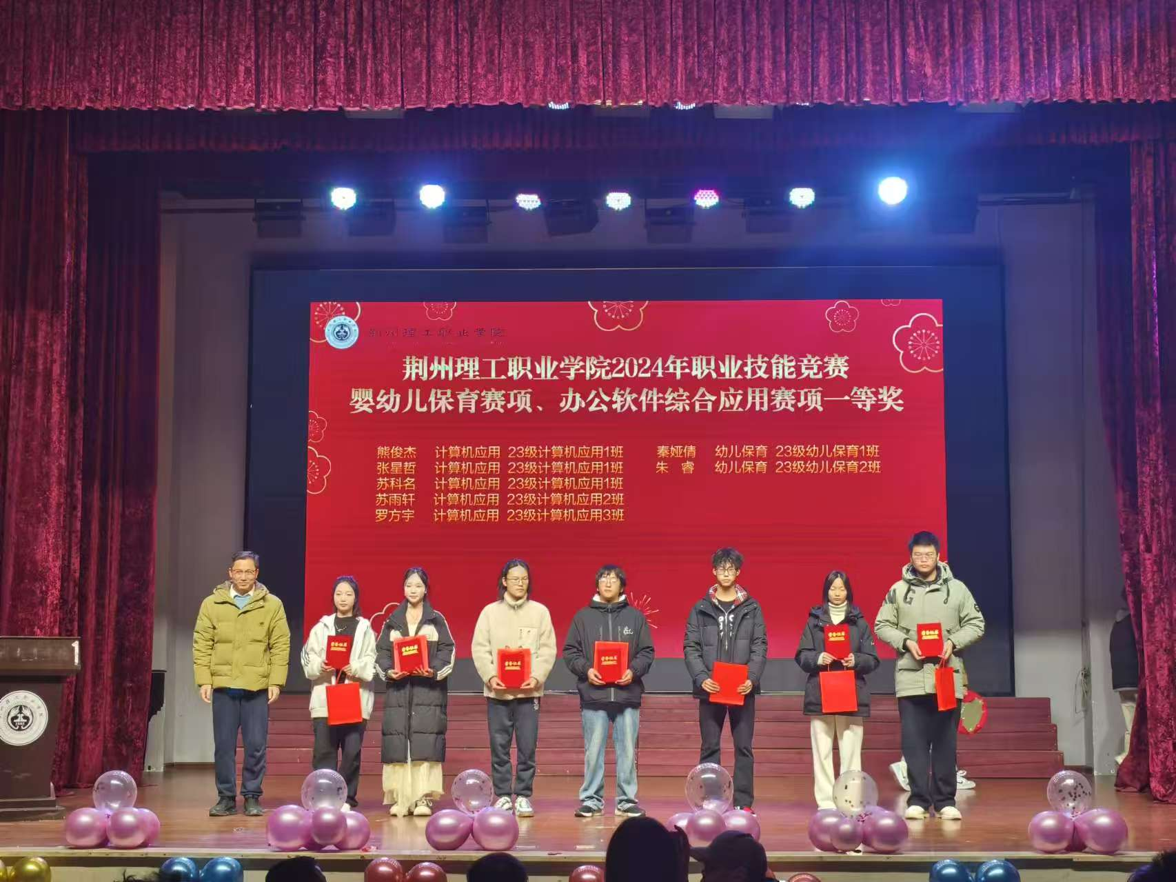紧接着,马海龙副书记宣读了多项表彰决定,对在荆州理工职业学院2024年职业技能竞赛婴幼儿保育赛项、办公软件综合应用赛项、无烟校园主题绘画比赛以及"文明班级"、"文明寝室"等评选中表现突出的个人和集体进行了表彰。颁奖环节中,崔玉林委员、王勇书记、亓俊国主任等领导分别为获奖者颁发了荣誉证书和奖品,鼓励他们在新的一年里继续发挥模范带头作用。