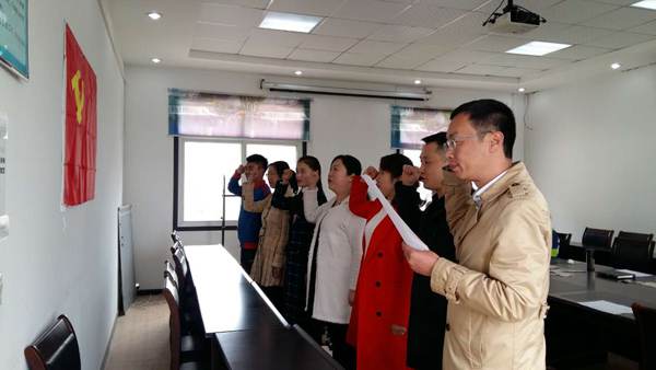 面对党旗,党支部书记王勇同志带领全体党员宣读誓词"我志愿加入中国共产党,拥护党的纲领,遵守党的章程……",在鲜红的党旗下,各位党员高举右手庄严宣誓。